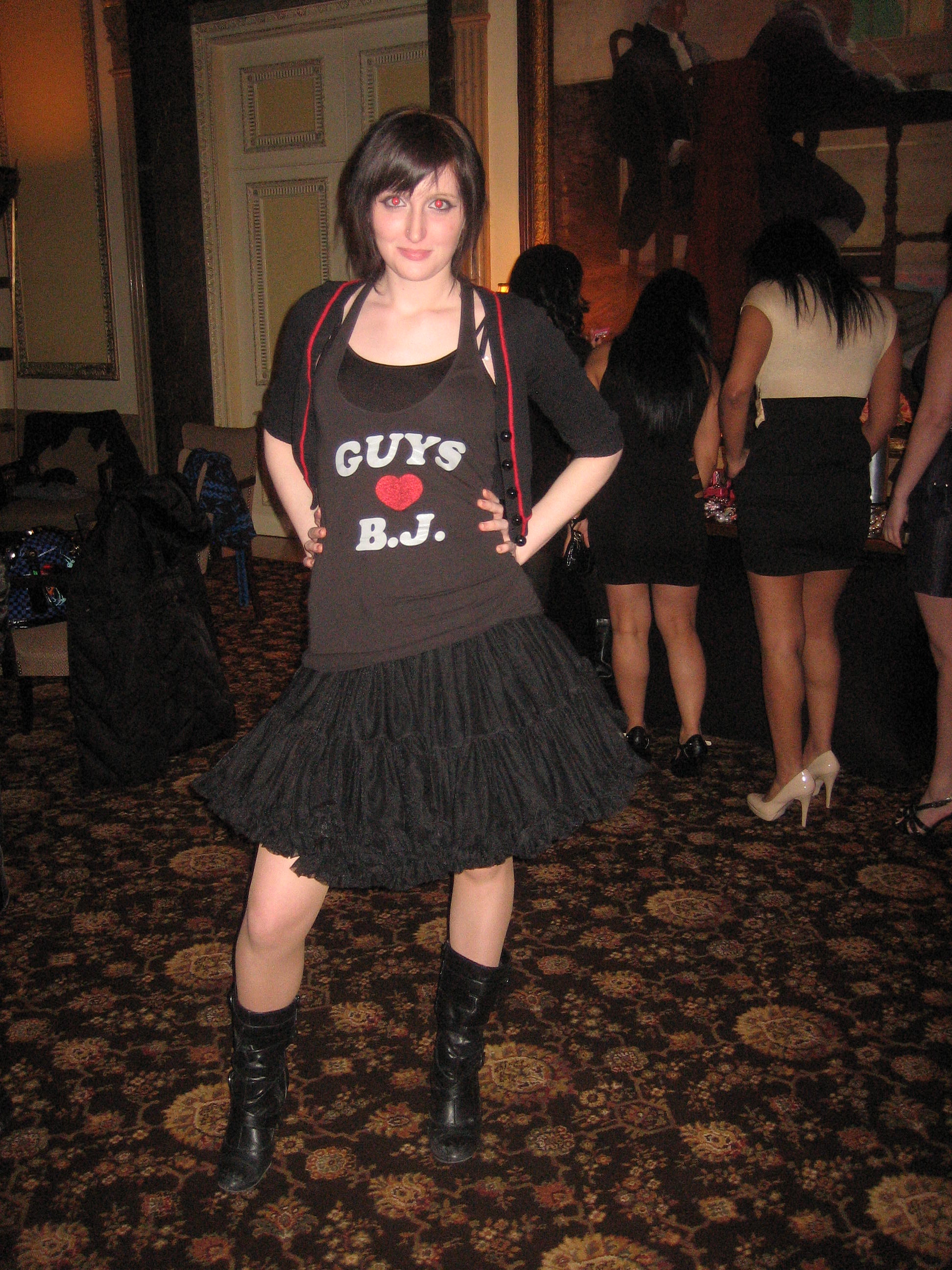 * Guys Heart BJ: This cheeky femme fatale is literally making several bold statements. Her black wifebeater is splashed up with with BJ’s classic proclamation paired with a goth tutu and leather boots. She amplified the raciness with the label “sex pot” stitched onto the back of the seemingly basic black cardigan.