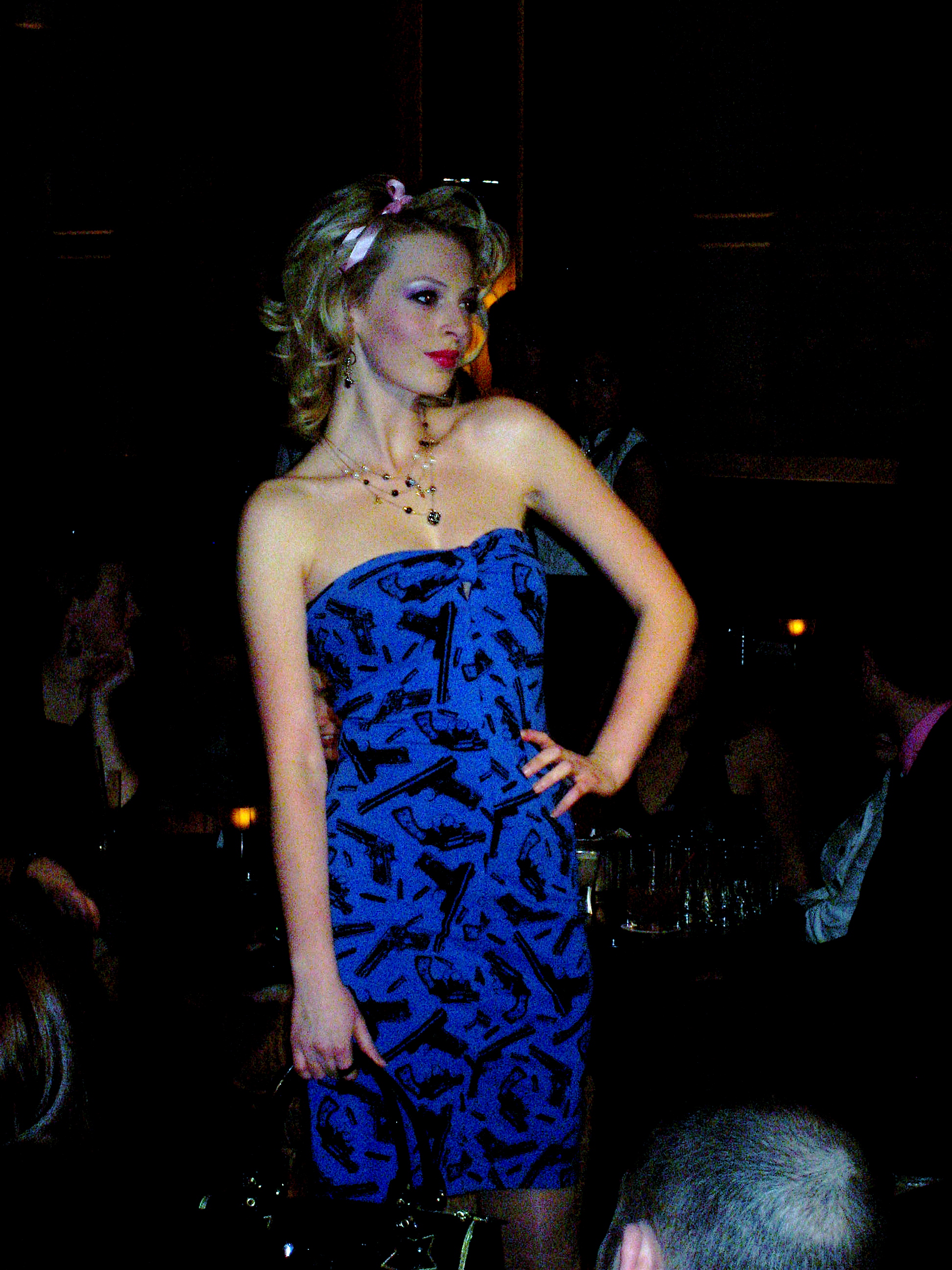 * Old School Gangser Dress: This look was definitely more on the tougher side of the spectrum. This cobalt blue sheath dress is unique because the print consists of cool vintage black guns. Pair this look with leather jacket and retro waves and you could surely double as one of the pink ladies from Grease.