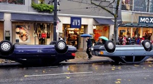 In other destructive fashion news, the entire Gap store in Vancouver has been turned upside-down— but not out of malice. Featuring mannequins suspended from the ceiling, overturned cars and storefront signs rotated 180 degrees, the American brand is attempting to market its customer loyalty program, Sprize. With the slogan, “shopping turned on its head,” Sprize addresses frustrated customers who buy a full priced products that go on sale by giving back SprizeMoney to use on future purchases.