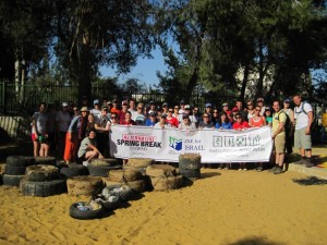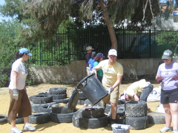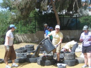 At 7:45am, we were on the bus headed for Be’er Sheva, where we would spend the day working at Earth’s Promise. It was our job to collect garbage and debris that was scattered across the land and use it in the construction of useful things like benches and playthings for children. I personally worked on “the monster,” which was a turtle-shaped plaything that we were building in a park to help entertain children. First we had to collect tires and lie them down on the ground in the shape of the turtle structure. We sloped the tail downward by layering the tires so that it would be like a slide. As for the rest, we alternated single and double tires to give the turtle a bumpy texture fun for children. Once we got the structure down, we tied it all together and stuffed the tires with garbage that we had collected around the park.