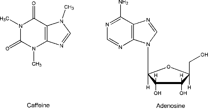 Caffeine functions by preventing the actions of neural chemical adenosine, which is a neural inhibitor (an important role if you are trying to sleep). Since caffeine and adenosine have similar but not identical chemical structures (see figure below), caffeine can associate with adenosine receptors without initiating any of adenosine’s inhibitory actions, while simultaneously preventing adenosine from interacting with its receptors. In the neurobiology world, this type of interaction is called antagonism.