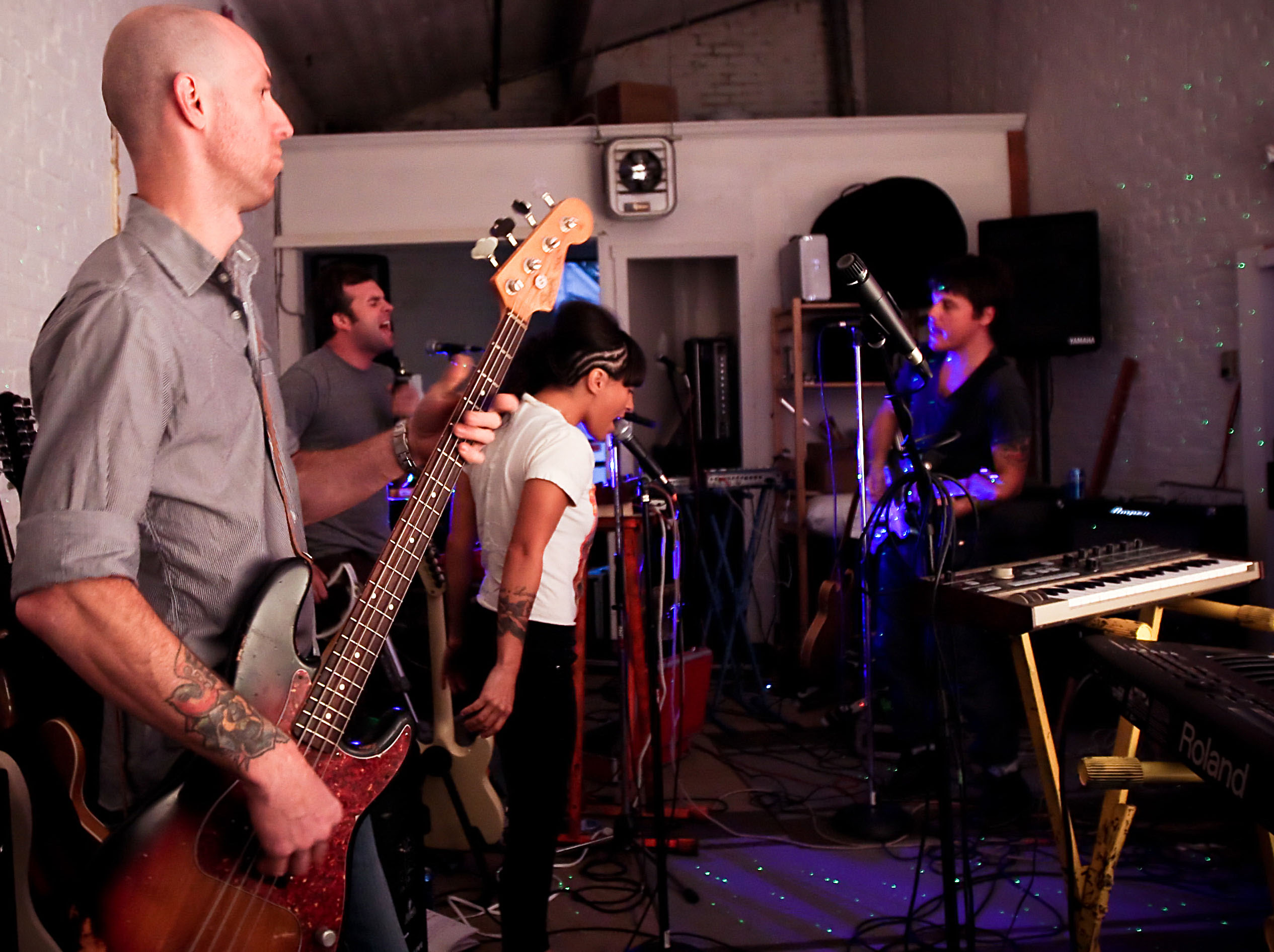 We don’t have a drummer, we generally have live percussion. Mac is the DJ in charge of electric beats. We have a guitar and bass—we all sing. Jake plays ukulele. None of us can really play keyboard. I can play a mean tambourine. We use cowbells sometimes. We all kind of came from different musical backgrounds. I grew up skateboarding and playing in punk bands so I knew guitar. Jake’s family is very musical, and Mac grew up on hip hop.