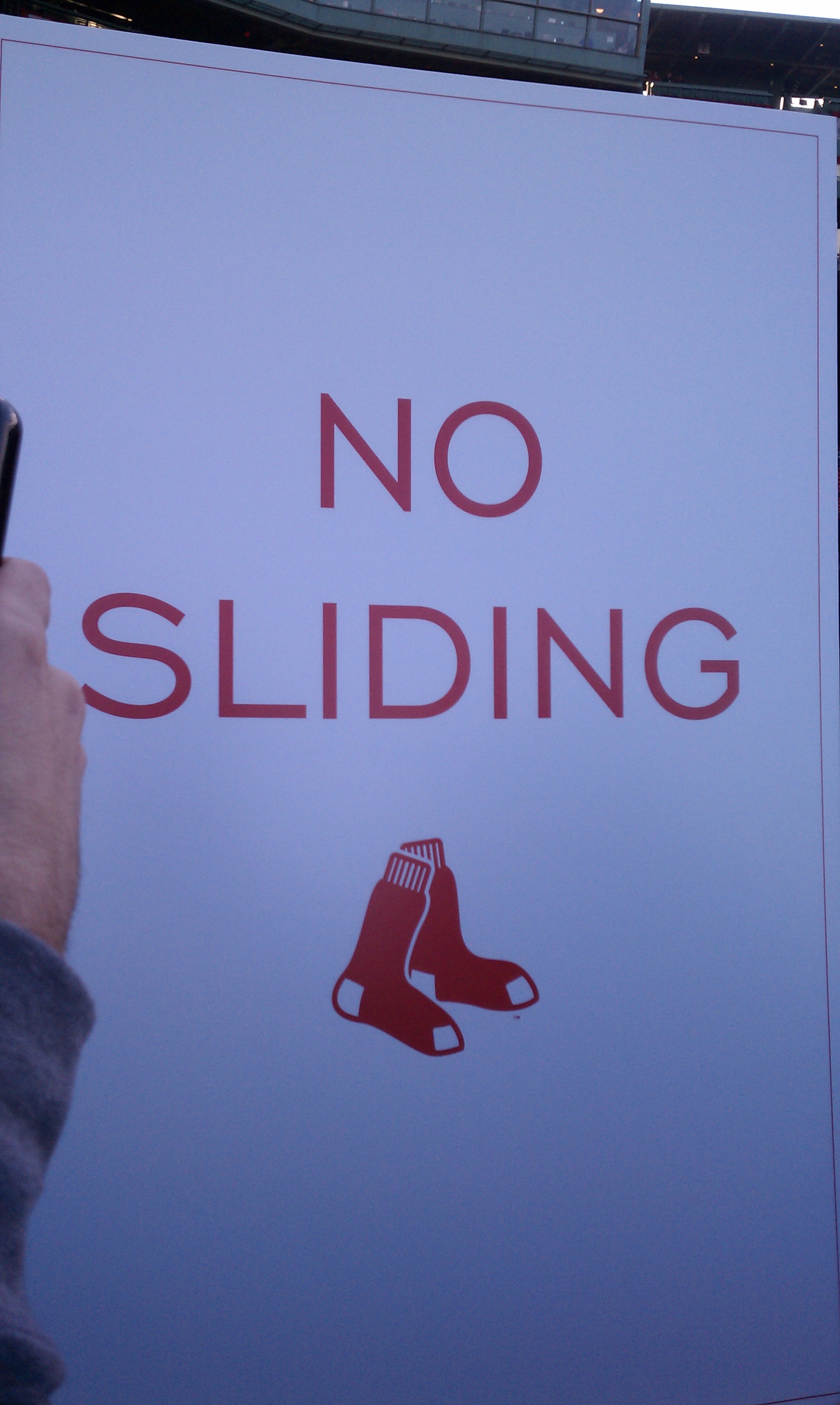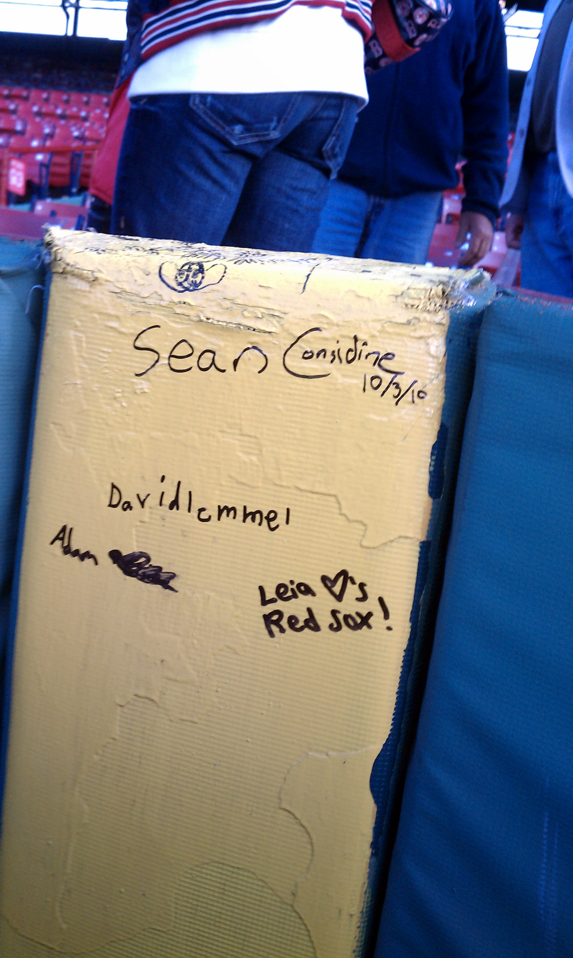 Well, I was right about one thing—the fans did not storm the mound after the game, even after a no-score inning for Papelbon in the 9th to close the game. However, all of the fans were allowed to walk around the field after the game in a more orderly fashion, as well as run around the bases and sign their names on Pesky’s Pole, the foul pole in right field.