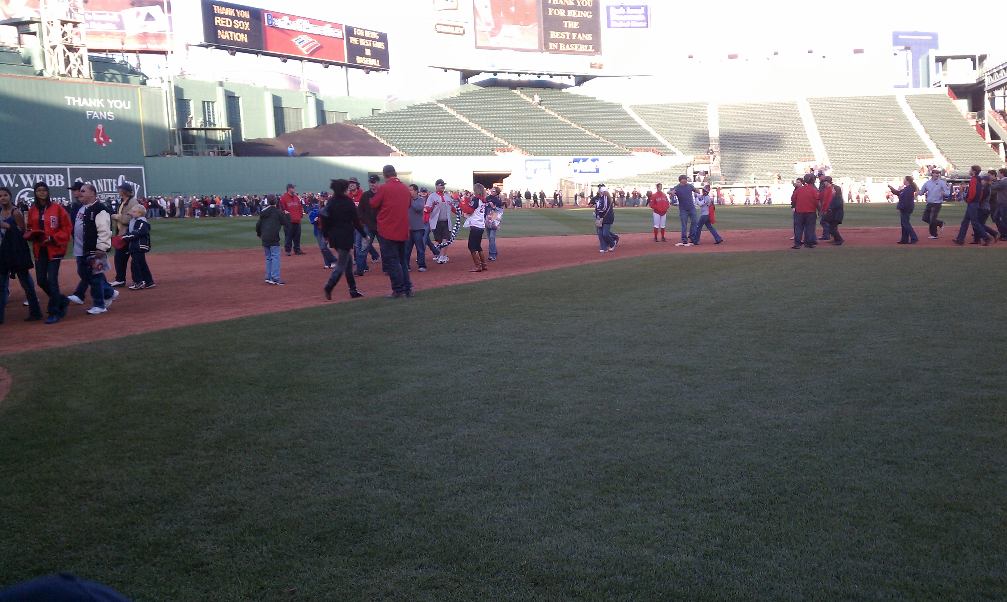 I blinked for a second, trying to process what I had just heard. Were they really letting all of these people on to the field after the game? I had never heard of the Red Sox doing this in the past. The image that came to my mind was one of the fans jumping over the walls and on to the field after the game, storming the mound. I laughed to myself at that picture and decided the Red Sox would never let us do that; they probably meant that they will let one or two fans on to the field.