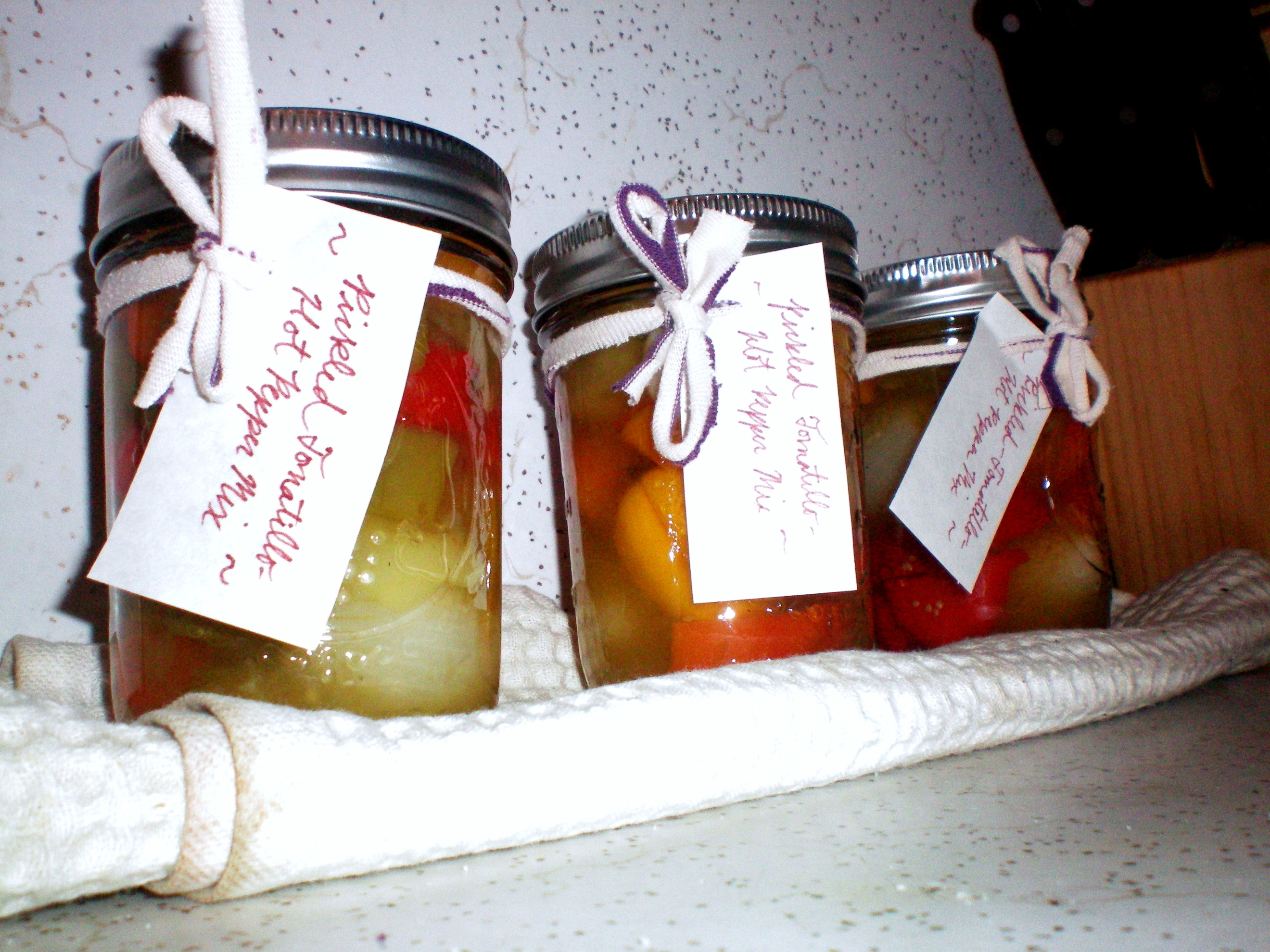Apparently, you can use the mix to make an excellent salsa-style sauce by draining the liquid from the jar and chopping the vegetables coarsely in a food processor. I plan to use it as a marinade for a grilled tofu sandwich. Even though everything didn’t go exactly as planned, I overcame my fear of canning and ended up with three perfectly sealed jars of the Pickled Tomatillo-Hot Pepper Mix. The last jar, as I mentioned earlier, was not completely filled, so I put it in the refrigerator and have been snacking on it all week. Surprisingly, the mix is especially delicious on a piece a toast with crunchy peanut butter! So, try out the recipe for yourself and remember, MAN BEFORE CAN. If I can do it, you can do it!