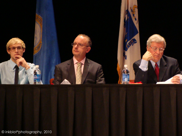 The affirmative team for The Great Debate waits to begin their arguments against corporate funding in political campaigns. The team consists of (from left) Austin Bay CAS'12, Graham Wilson, Professor of Political Science at Boston University and Thomas E. Mann, Senior Fellow in Governance Studies at The Brookings Institution. Photo by Cate Young.