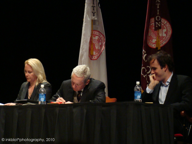 The negative team waits to rebut the issue at The Great Debate on Wednesday. The panel consists of (from left to right) Allison R. Hayward, VP of Policy for the Center for Competitive Politics, John Samples, Director for the Center for the Representative Government at The Cato Institute, and James Robinson, an M.S candidate in the department of journalism at B.U.'s College of Communication. Photo by Cate Young.