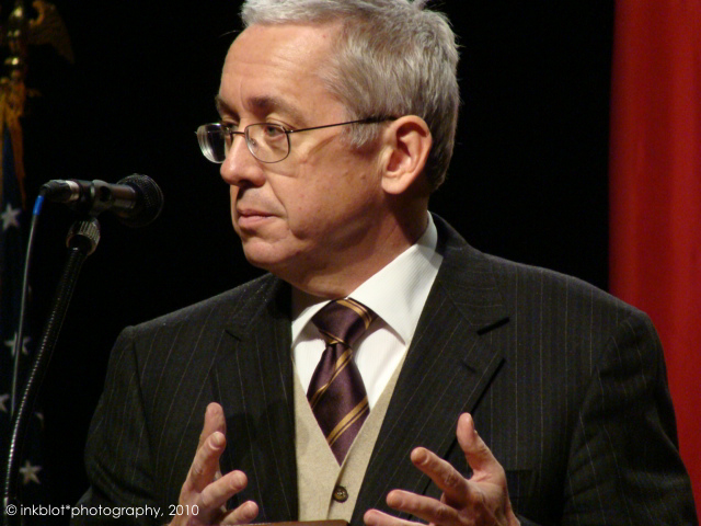 John Samples, of the negative side, explains the First Amendment and issues surrounding limitations on campaign funding."I'm perfectly aware that many in this room may not like speech by corporations, but the question you have to ask yourself is 'because I don't like it, should it not be heard? should there be prior restrint from the government?'" Photo by Cate Young.
