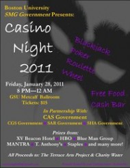Tickets for Casino Night are $15, which include 10 raffle tickets, playing chips, free food, and a cash bar for those over 21 (appropriately dubbed the “High Rollers Club”) . Various groups have donated over $3,000 in raffle prize, including an XBOX 360, tickets to the Blue Man Group, and a signed Boston Bruins hockey puck.