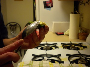 3. To prepare the jalapenos, you may want to wear plastic gloves. If you don’t have gloves, be sure to NOT touch your face or eyes until after you have thoroughly washed your hands. Slice the stem ends off the peppers and then slice them in half lengthwise. Using a spoon, scoop out all the seeds and discard. If you want to set your friends’ mouths on fire, leave some in.