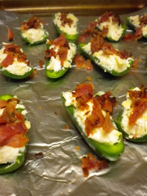 6. Bake the jalapeno poppers in the 375 degree oven for about 20 minutes. You want the peppers to be roasted and the cheese to be a light golden color. Serve the poppers while they are hot!