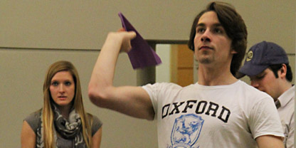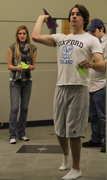 The week began with a Paper Airplane contest, sponsored by BU’s chapter of the American Institute of Aeronautics and Astronautics. Also present were a handful of members from the school’s chapter of Students for the Exploration and Development of Space. There were about a dozen people in attendance, each with a paper airplane of his or her own construction. These planes would be put through a battery of tests and challenges.