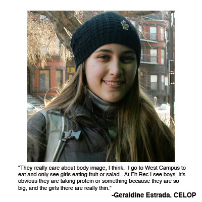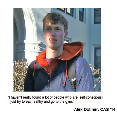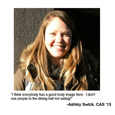 Between Late Nite’s BU platter, the GSU’s panda bowl and the dining hall’s endless buffet, making healthy choices can be a hard thing to do. Wednesday night’s “Lovin’ the Body You’re In” body image and food forum (which the Quad covered) prompted us at the Quad to wonder what BU students’ take on healthy body image on campus is. Here’s what students said when asked: