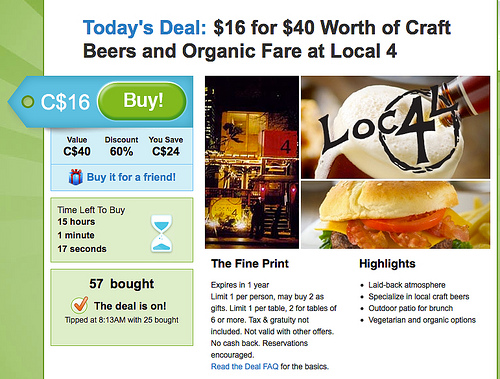 Many copycats have sprung up after Groupon’s meteoric rise, the most prominent being rival Living Social, which was launched in July 2009 as a social buying company and then offering daily deals shortly after Groupon. Other sites such as BuyWithMe, Edhance, Whatever.com, & KegFly specifically target college students and all have Boston outposts. All require a simple membership and the deals are varied on each site. Just recently WhitePages launched DealPop, offering up to 70% off on restaurants and things to do in various Boston neighborhoods.