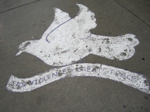 The dove and words are the result of a 2008 Paint for Peace program started by Robert Guillemin, a.k.a. Sidewalk Sam. He wanted to paint up to 600 doves on sidewalks around Boston and enlisted youth from the Hyde Park Task Force to help paint the doves in front of bodegas and stores around Jamaica Plain.