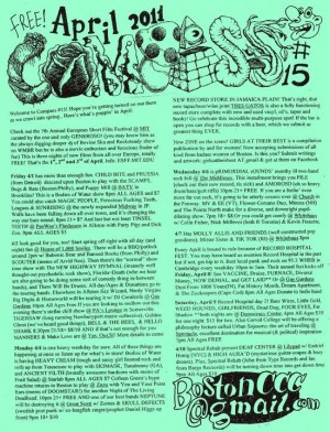 The Counter Cultural Compass is a monthly zine and an online resource that is a really great collection of local happenings. Again, these are the shows people do not hear about unless they have local connections. The creator of the Compass also runs the Whitehaus, a house venue in Jamaica Plain and a record label for lots of great local bands.