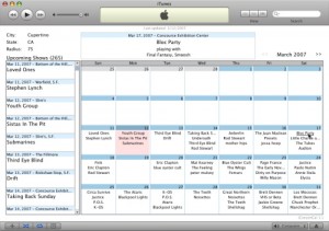 iConcert Cal is a listing of local shows that is easier to navigate. It is also more in depth. This is a free application that can be downloaded online. It creates a calendar that lists the appearances of bands in a subscriber’s iTunes. Subscribers can enter the zip code nearest to them and then scroll though the months. Also, whenever the subscriber plays that music on their iTunes, an alert pops up in the upper right hand corner letting them know if and when (and where and with who!) that band is playing, as well as any upcoming album releases.