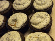 5. Either fill a pastry bag, snip off the end and frost the cupcakes, or plop a scoop of frosting on top of each cupcake and spread to the sides.