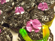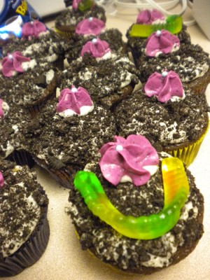 If cupcakes don’t sound appetizing after all that talk about worms, take a trip back to childhood with me. One of the easiest and most exciting desserts to have as a kid is “Worms ‘n’ Dirt.” Pop open some chocolate pudding, throw some crushed cookies on top and throw on some gummy worms. This recipe takes the classic Worms ‘n’ Dirt dessert a step further, as it is all held together by a cupcake.
