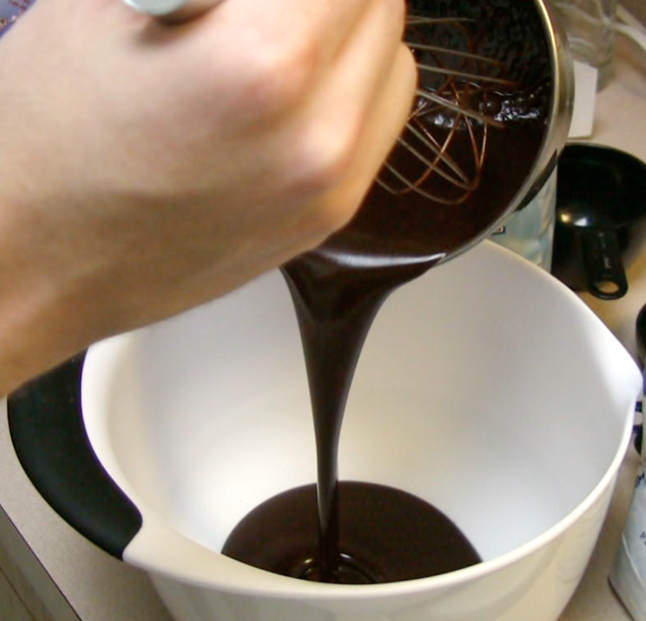 In a saucepan, melt 2 sticks butter or margarine with 4 squares (4 oz) unsweetened baking chocolate.