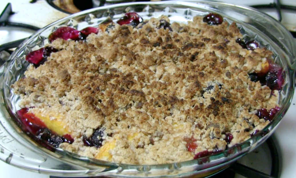 Pour your fruit mixture into a baking dish (I used a 9″ pie pan), and then distribute the flour/butter mixture evenly on top of the fruit. Bake in the preheated oven for about 40-45 minutes, or until the fruit is tender when pierced with a fork and the topping is golden brown and crumbly.