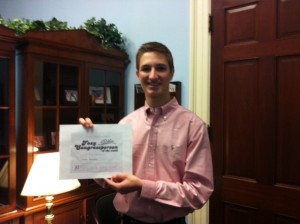 I was greeted at the door by Alex, a lovely young man who was either an intern or the only person on Capitol Hill who actually gets paid to answer phones (I didn’t ask because either way the answer is sad). I wasn’t quite sure how to go about telling Alex that I thought his boss’s boss was foxy, but I gave him a little spiel about The Quad and this column, and he seemed amused and much more excited than I had anticipated. He asked me if there was a story online, to which I replied that there would be and I would be happy to send him a link. He started writing down his e-mail address, stopped in the middle and asked me if this was “a mock” at which point I assured him that, while definitely goofy, Foxy Congressperson of the Week is in no way a mock. I took his picture with the certificate, thanked him for his time, and left the office feeling slightly relieved.