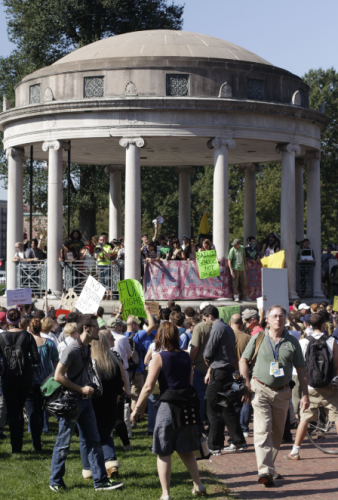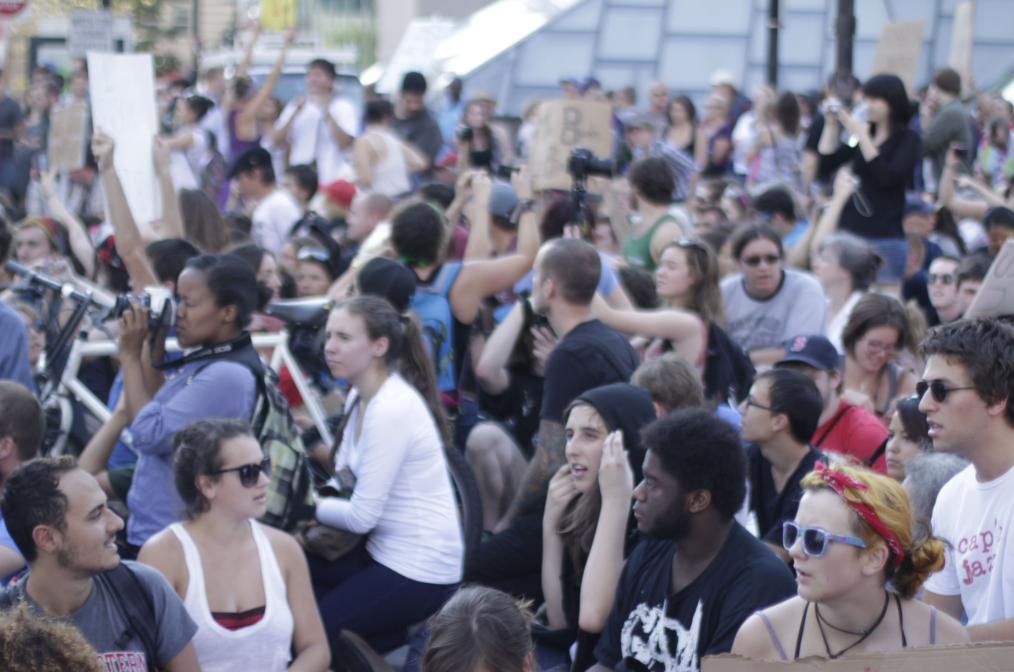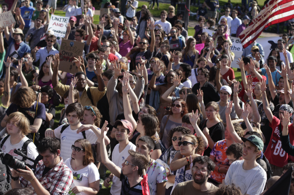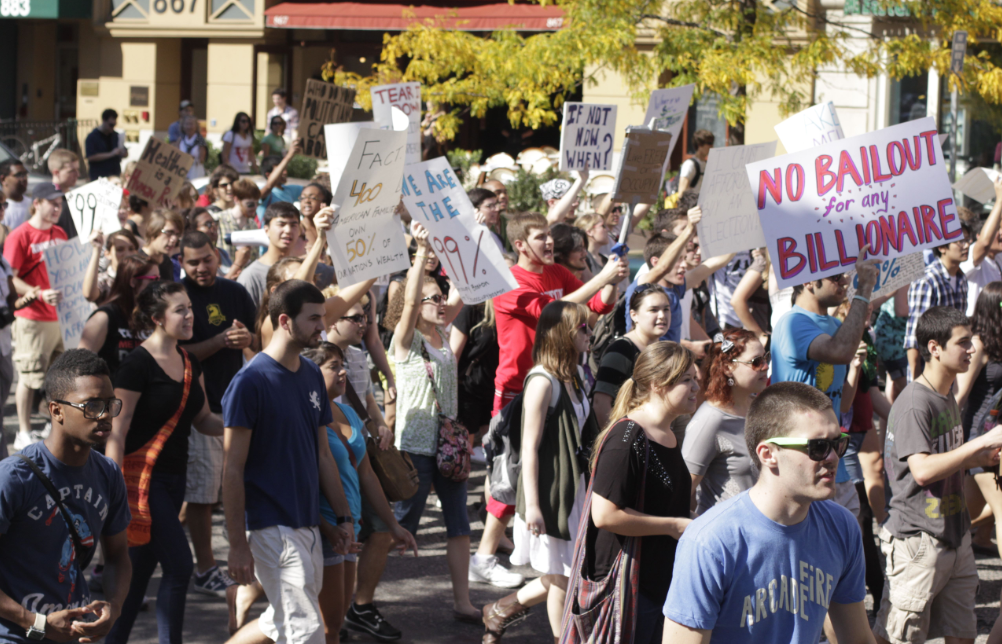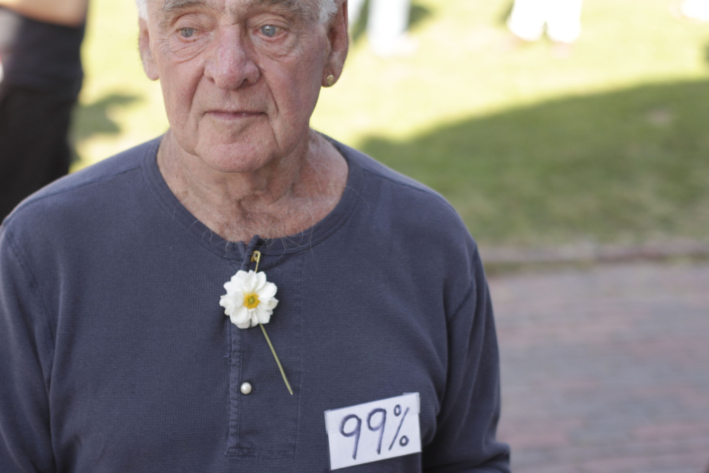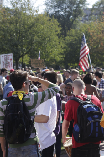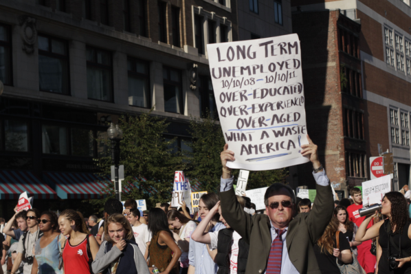 Marchers show their support.Marchers take a seat in Dewey Square.An unemployed member of the 99% holds a sign as the march continues around Dewey Square.