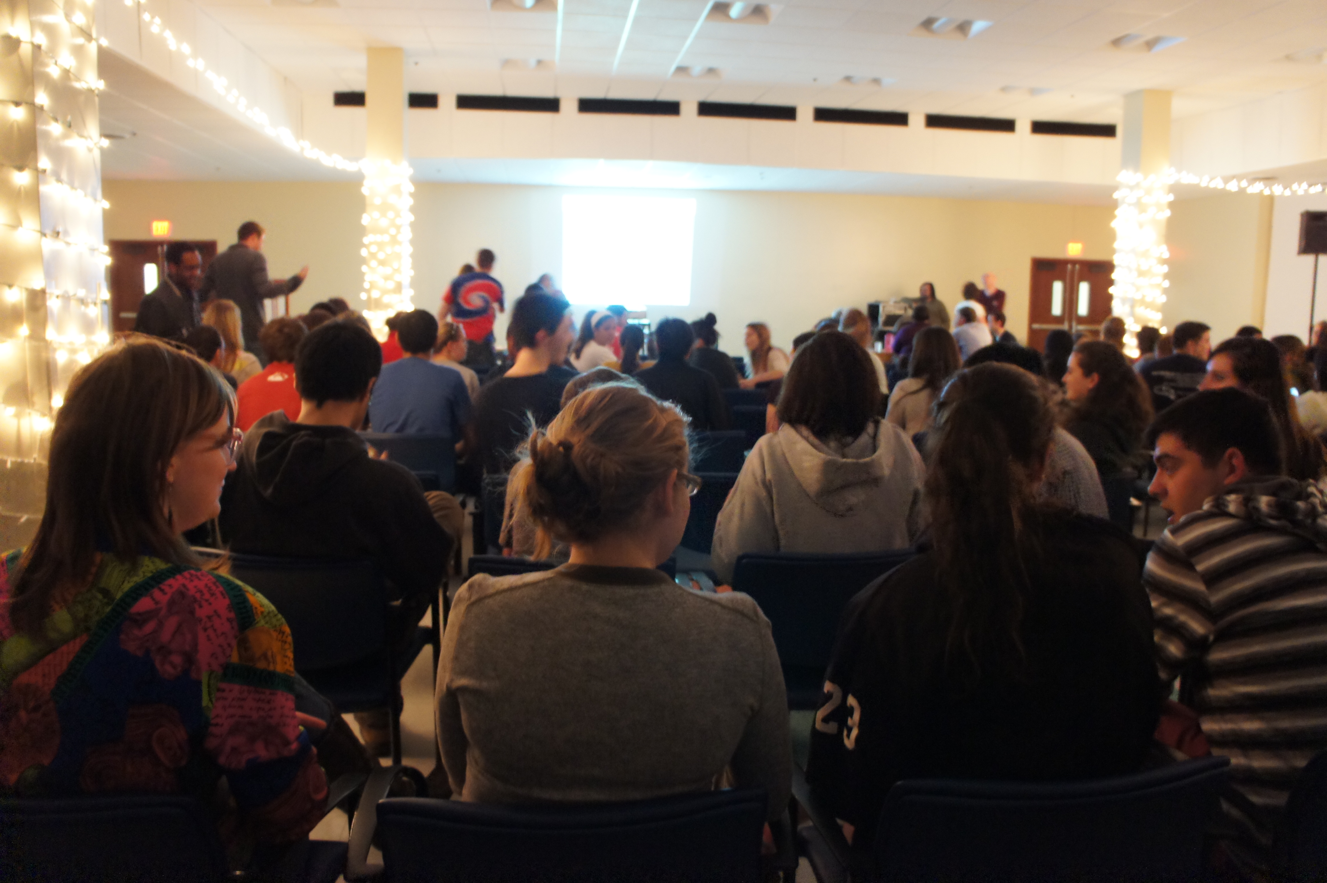 The faculty-in-residence from each tower put together the second-annual competition and served as judges as students got in touch with their inner rock star. I’m using the term “competition” lightly here; really everyone was there to sing their favorites with their friends, not win some t-shirts. The cinema room was softly lit with Christmas lights, something I was thankful for when I took the stage and promptly turned bright red as my roommate and I put our own spin on Hilary Duff’s “Come Clean.”