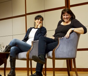 Sarah’s playfulness was clear right away. Only a few minutes into the night, while introductions were still being made, an audience member’s phone rang. Instead of ignoring the interruption, as many others would have done, Sarah mimed her own phone call and called a mocking “Hello!” into her hand. The gesture won a big laugh from the crowd. Just a few minutes later, while Dean Sapiro asked her first question, Sarah was busily playing with her microphone. The amused look on her face was enough to earn another laugh from the audience.