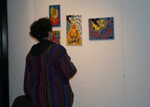 In partnership with the Western African Research Association, the gallery currently features the exhibit “Yelimane Fall: African Calligraphy in Action.” The Sengalese artist Yelimane Fall is also an activist. Fall’s personal motto is “Faith, Uprightness and Knowledge for an interior and universal peace.” This motto reads like the thesis statement for the vibrant body of work adorning the walls of the gallery. Some works were titled succinctly, “The Book,” or “Peace and Prosperity,” while others were named in phrases such as, “Your partner in life is your wife,” or “If men learn to live together, they will have paradise on Earth and in the afterlife.” The works feature Arabic calligraphy most prominently, as well as acrylics, pencil and patterned fabrics. Some pieces were made with reflective material backing as a metaphorical representation intended to encourage inner reflection.