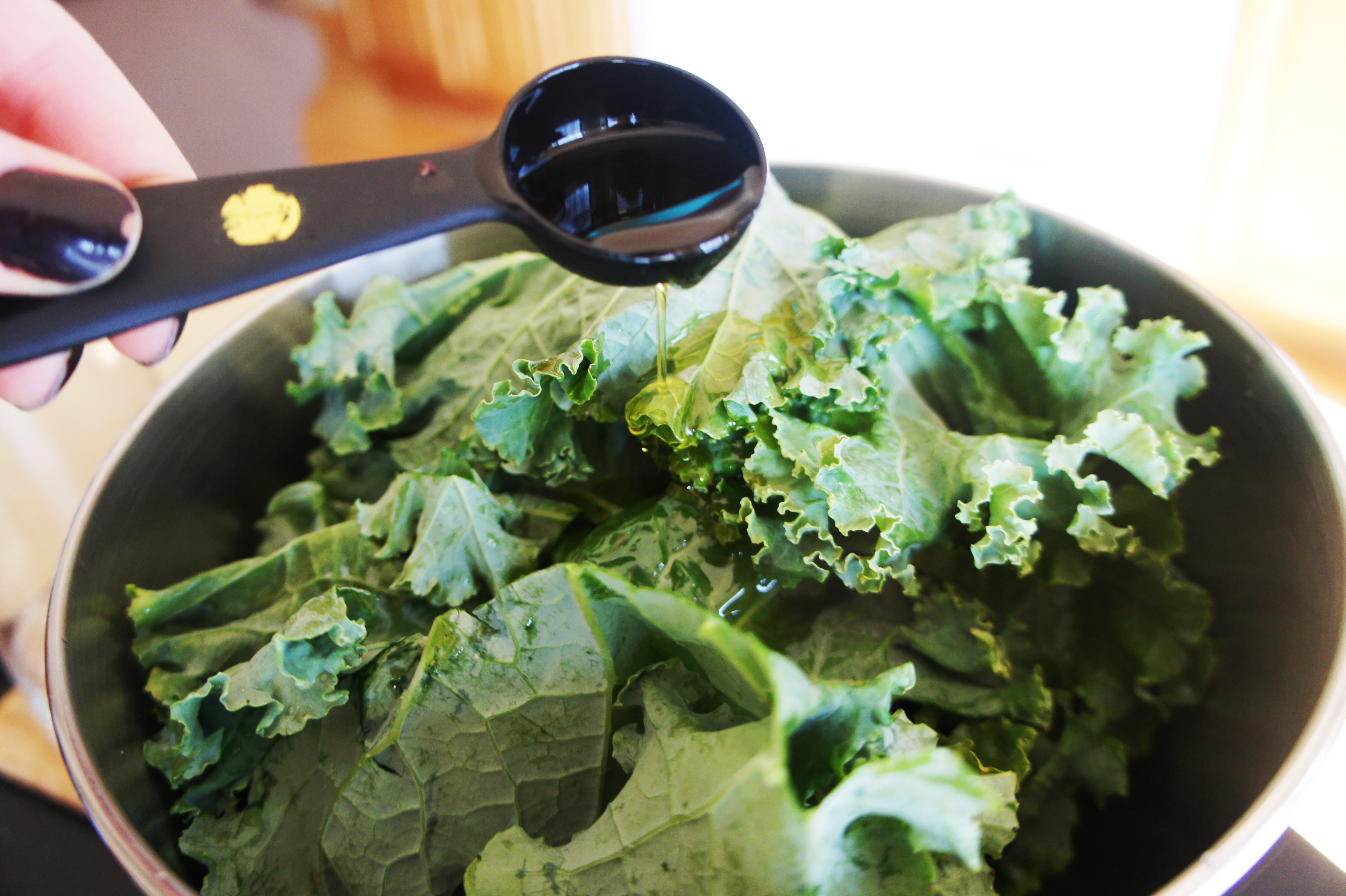 Pat kale leaves with paper towels to ensure they are dry. | Photo by Estefania Souza. - Toss kale with olive oil, making sure to coat all of the leaves. Sprinkle with salt and pepper and toss again.