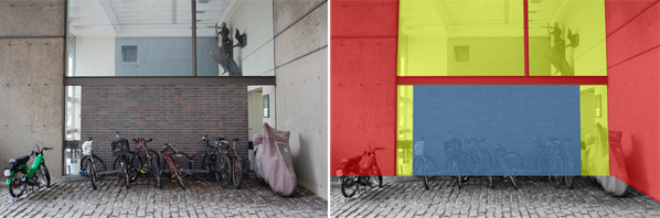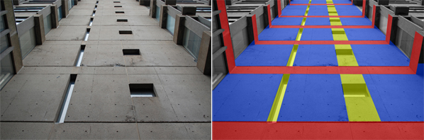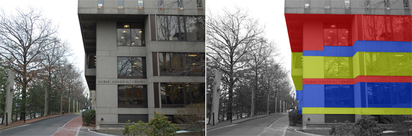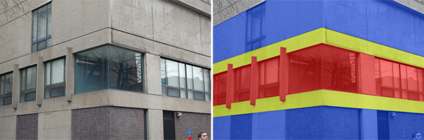 The library, when seen from behind, is definitely split into three layers: three layers of windows, three layers of vents, three levels of horizontal concrete strips. The most interesting formation occurs on the left-hand side, where the distant law building fills in and completes the third layer.