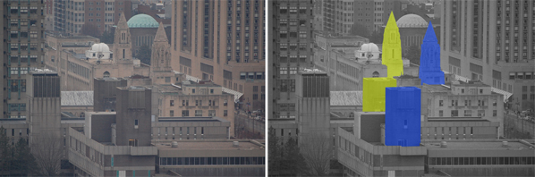 The two towers capping the GSU contain maintenance and air conditioning. When seen from the right angle (in this case, the 26th floor of Student Village 2) the homage it pays to BU’s central campus is clear. The two modern towers reference the two gothic towers of the College of Arts and Sciences and School of Theology.