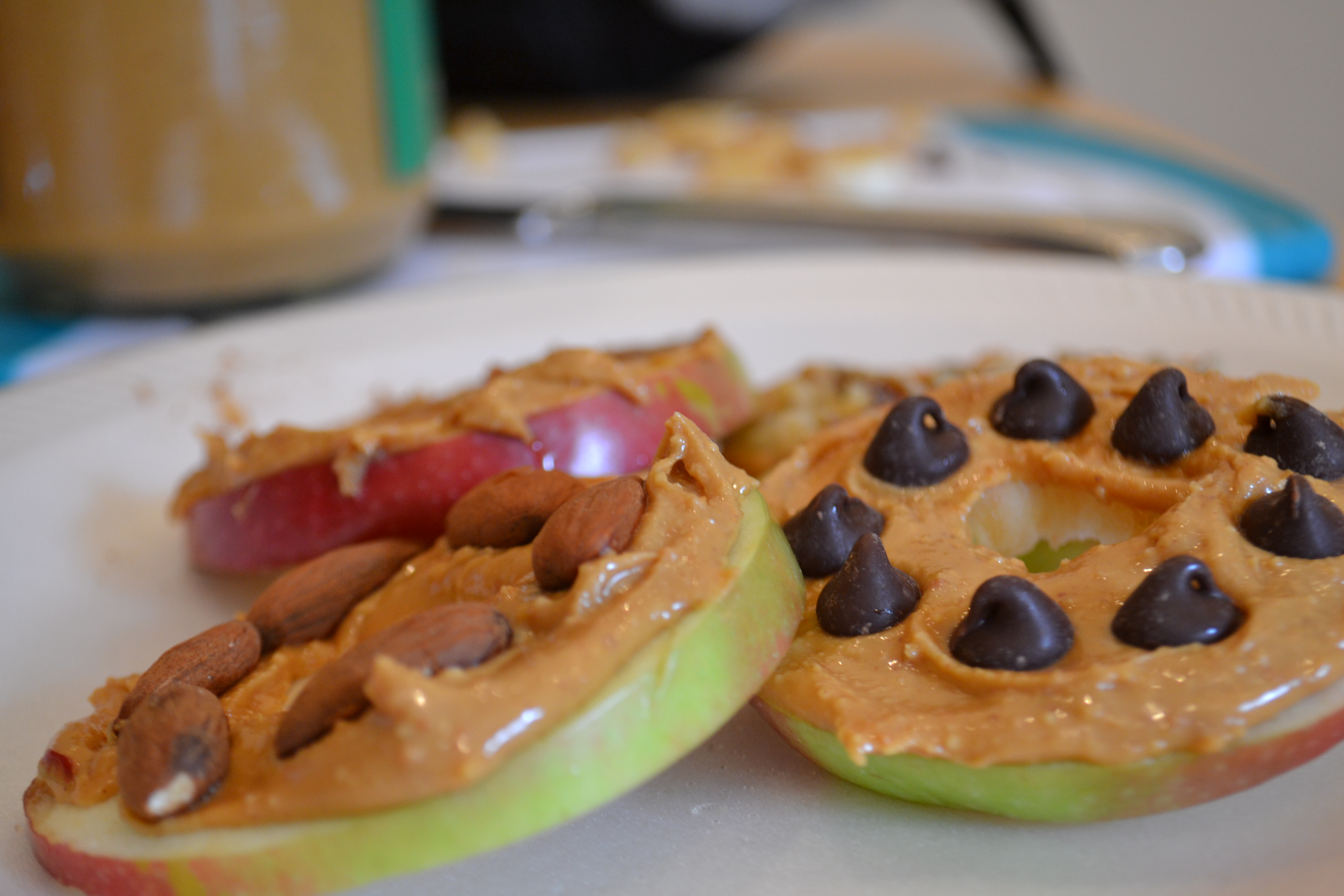 Using a sharp knife that will cut through the core, slice apple horizontally so that you are left with four apple circles. Take knife and carve out centers, making a doughnut shape. Spread peanut butter on one side of each apple slice. Top one with almonds, another with chocolate chips, the third with walnuts and the fourth with maple syrup and cinnamon.