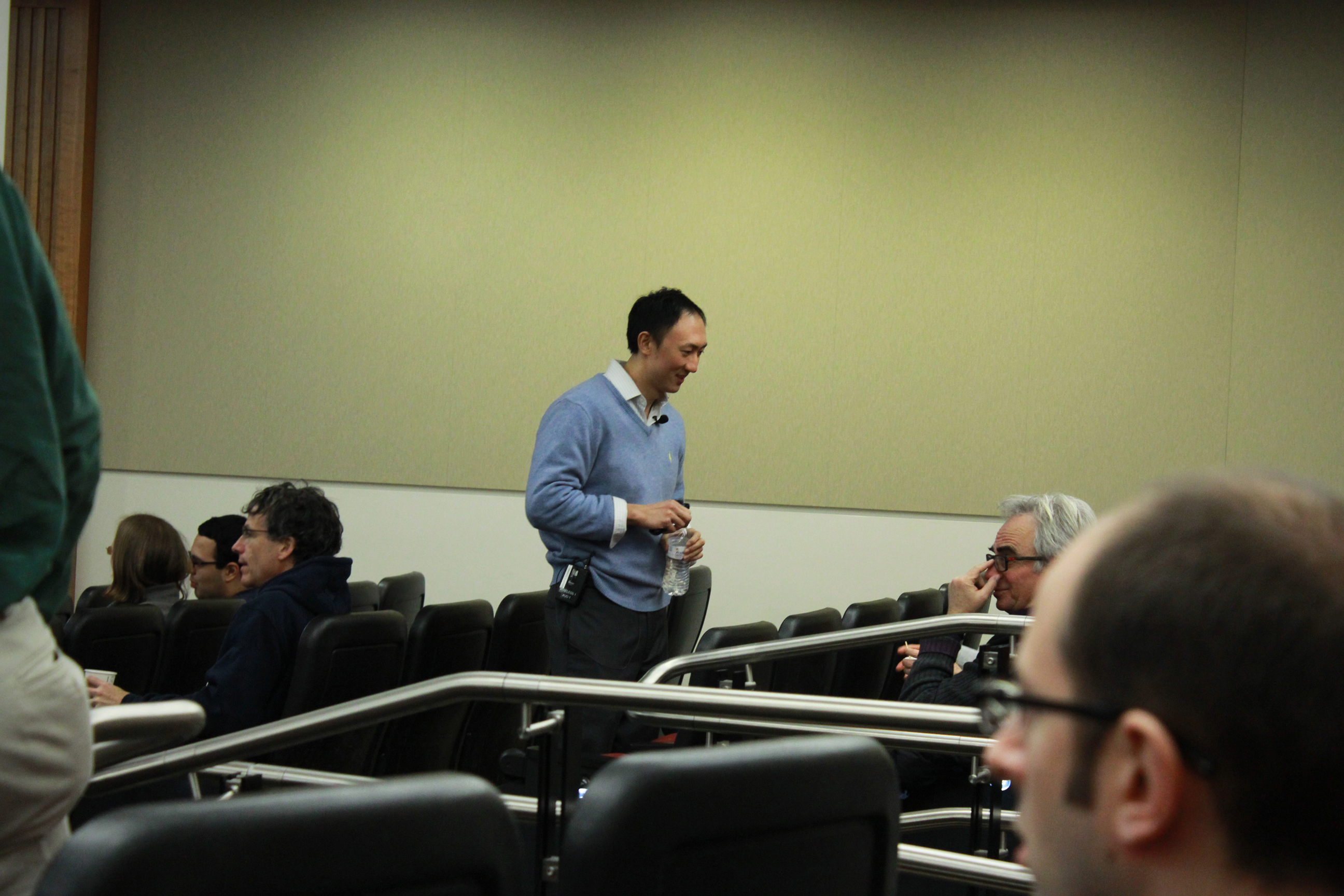 A modest-looking man converses with a female student seated toward the back of the auditorium. When asked if he is here to see the presentation, he replies, “I’m actually the …
